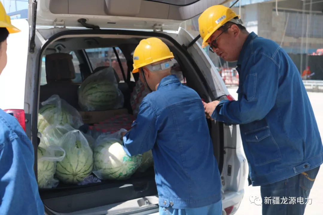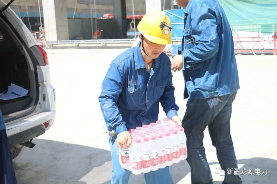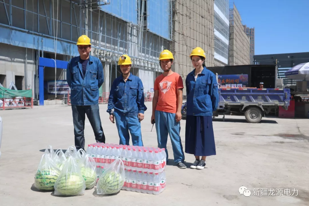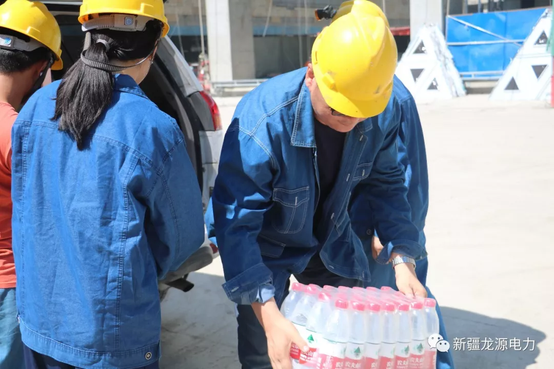 2018年8月9日,龍源電力黨支部來到正在施工的昌吉匯嘉項目工地進行慰問,將公司的關懷及時傳遞給一線員工,黨支部為辛勤在一線崗位上的勞動者送去清涼和問候。